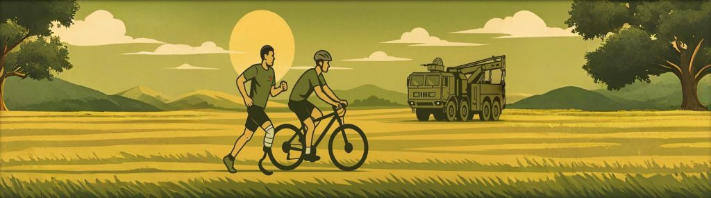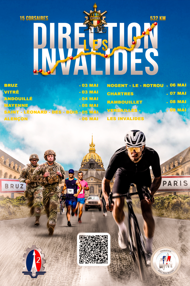 Afin de mettre en lumière la cause des blessés des armées tout en recueillant de l’argent au profit des « Bleuets de France », 5 équipes du 2 RMat relieront la ville de BRUZ à l’hôtel des invalides à PARIS. Chaque équipe sera constituée de 3 personnes (trinômes) sur le principe du « run and byke » : (deux pédalent pendant qu’un court).